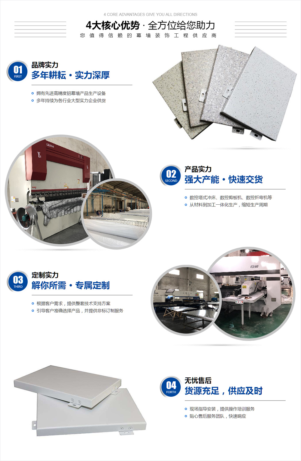 廣東申澳建材有限公司旗下品牌“申澳鼎泰”位于珠三角商貿重要經濟區之一:佛山市南海區里水鎮,公司擁有先進高精度鋁幕墻產品生產設備、數控塔式沖床、數控剪板機、數控折彎機等以及進口自動氟碳噴涂設備、是集生產、銷售于一體的建材公司,其主要產品有鋁天花和鋁幕墻2大系列,系列包含以下七大產品:雙曲鋁單板、弧形鋁單板 、穿孔鋁單板 、木紋石紋鋁單板、真石漆鋁單板、鋁窗花。